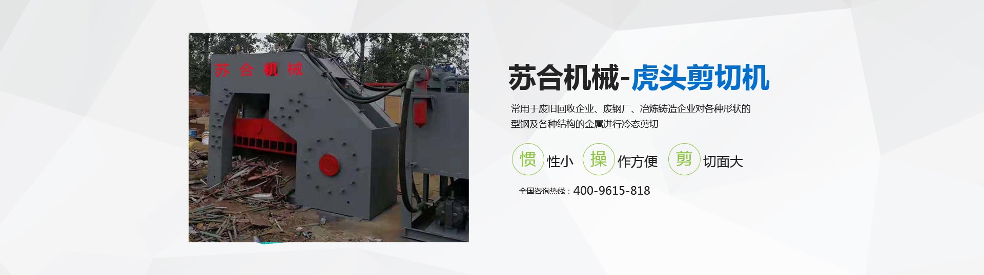虎頭剪具有體積小、重量輕、慣性小、噪音低、動作平穩(wěn)、操作方便、靈活、剪切斷面大、剪刀口調(diào)整方便等優(yōu)點,操作使用安全。常用于廢舊回收企業(yè)、廢鋼廠、冶煉鑄造企業(yè)對各種形狀的型鋼及各種結(jié)構(gòu)的金屬進行冷態(tài)剪切。剪切機的用途就是用來剪切定尺、切頭、切尾、切邊、切試樣及切除軋件的局部缺陷等。 滑縣蘇合機械制造有限公司性能穩(wěn)定,操作簡單。歡迎來電咨詢 <了解更多>